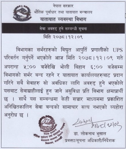 विभागले बुधबार दोस्रो पटक सूचना जारी गर्दै विद्युत आपूर्ति प्रणाली यूपीएस परिवर्तन गर्नुपर्ने भएकाले बुधबार साझँ ५ बजे (चैत ९गते) देखि बिहान ६ बजे (चैत १० गते) सम्मका लागि विभागको सर्भर बन्द रहने बताएको छ ।