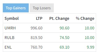 सो प्रतिशतले बढेर युनाइटेड इदि मार्दीको शेयरमूल्य ९९६.६० रुपैयाँ, राष्ट्र उत्थानको ८१९.५० रुपैयाँ र इमर्जिङ नेपालको ७६०.७० रुपैयाँ पुगेको छ ।