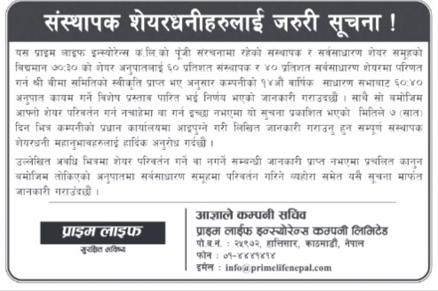 काठमाडौं । प्राइम लाइफ इन्स्योरेन्स कम्पनी लिमिटेडले संस्थापकतर्फ हाल कायम ७० प्रतिशत शेयर स्वामित्व घटाएर ६० प्रतिशत कायम गर्ने भएको छ । कम्पनीले संस्थापकतर्फ ६० प्रतिशत र सर्वसाधारणतर्फ ४० प्रतिशत शेयर स्वामित्व कायम हुने शेयर परिमार्जन गरेको हो ।
