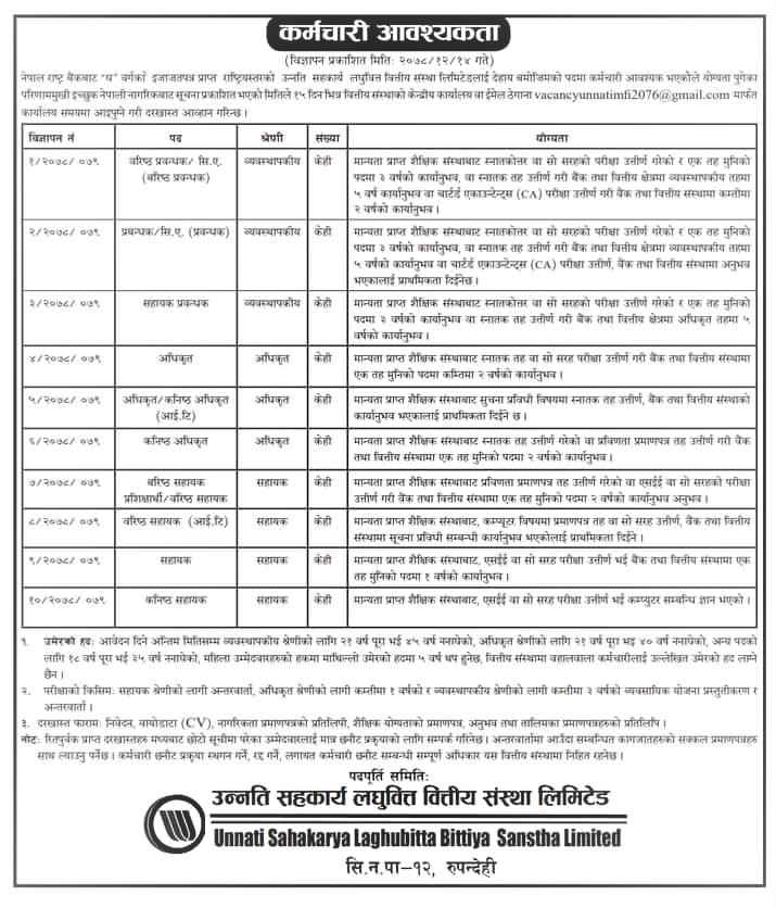 कम्पनीले बरिष्ठ प्रबन्धक/सिए (बरिष्ठ प्रबन्धक), प्रबन्धक/सिए (प्रबन्धक), सहायक प्रबन्धक, अधिकृत, अधिकृत/कनिष्ठ अधिकृत (आईटि), कनिष्ठ अधिकृत, बरिष्ठ सहायक प्रशिक्षार्थी/बरिष्ठ सहायक, कनिष्ठ सहायक, सहायक र कनिष्ठ सहायकमा केही संख्यामा कर्मचारी माग गरेको हो । जसका लागि शैक्षिक योग्यता मान्यता प्राप्त शैक्षिक संस्थाबाट एसइई उत्तिर्ण देखि स्नातकोत्तर तह उत्तिर्ण र विभिन्न बैंक तथा वित्तीय संस्थामा अनुभव भएको कर्मचारी मागेको हो ।