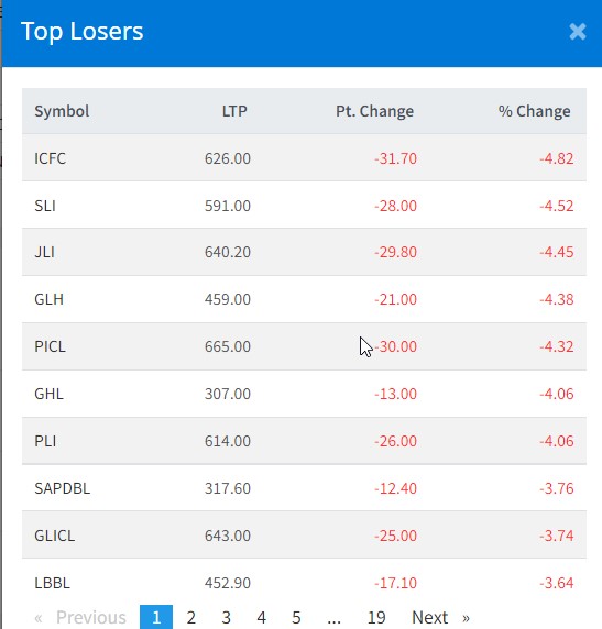 त्यस्तै, सानिमा लाईफ इन्स्योरेन्सको ४.५२ प्रतिशत, ज्योति लाईफ इन्स्योरेन्सको ४.४५ प्रतिशत, ग्रीनलाईफ हाइड्रोपावरको ४.३८ प्रतिशत, प्रुडेन्सियल इन्स्योरेन्सको ४.३२ प्रतिशत र घलेम्दी हाइड्रोको ४.०६ प्रतिशतले घटेको हो ।