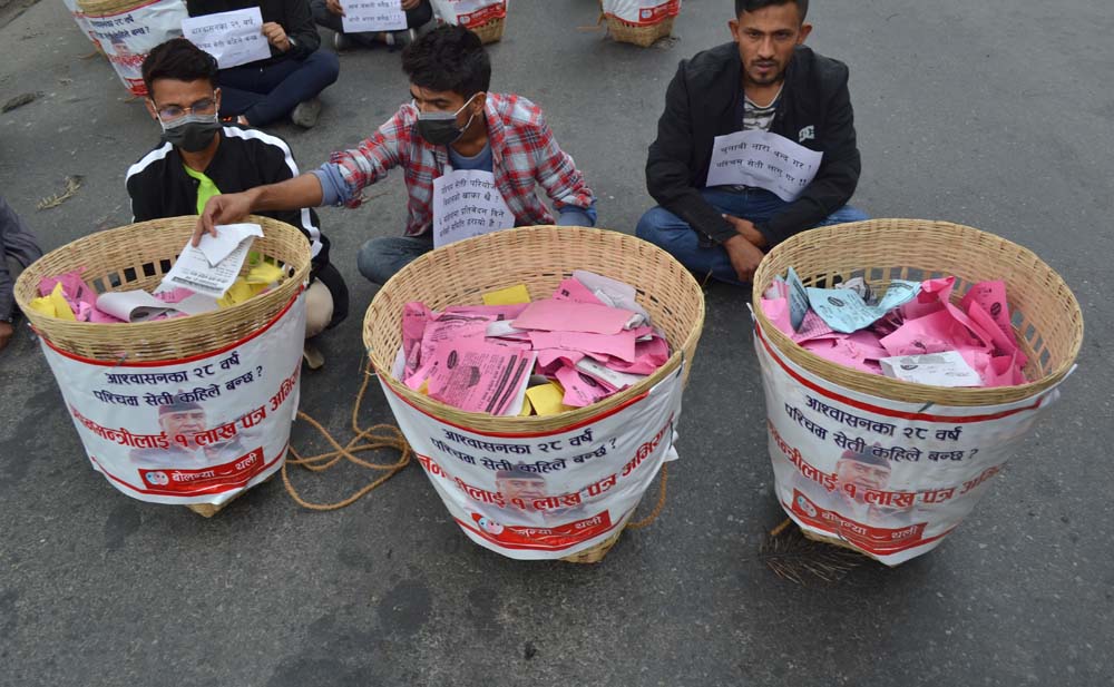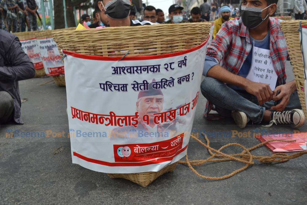 काठमाडौं । पश्चिम सेतीजलविद्युत निर्माणका लागि निरन्तर अभियान चलाउदैं आएको बोलन्या थलीले प्रधानमन्त्री शेर बहादुर देउवालाई बुझाउन सुदुर बासीका १ लाख चिठी र २२ डोका सहित काठमाडौंको माईतीघर मण्डला प्रदर्शन गरेको छ । ३ दिन मण्डलामा प्रदर्शन गरेर प्रधानमन्त्रीलाई डोकामा १ लाख सुदुर बासीका पत्र चैत १६ गते बुझाउने कार्यक्रम रहेको बोलन्या थली धनगढीका संयोजक यादव जोशीले बताए ।