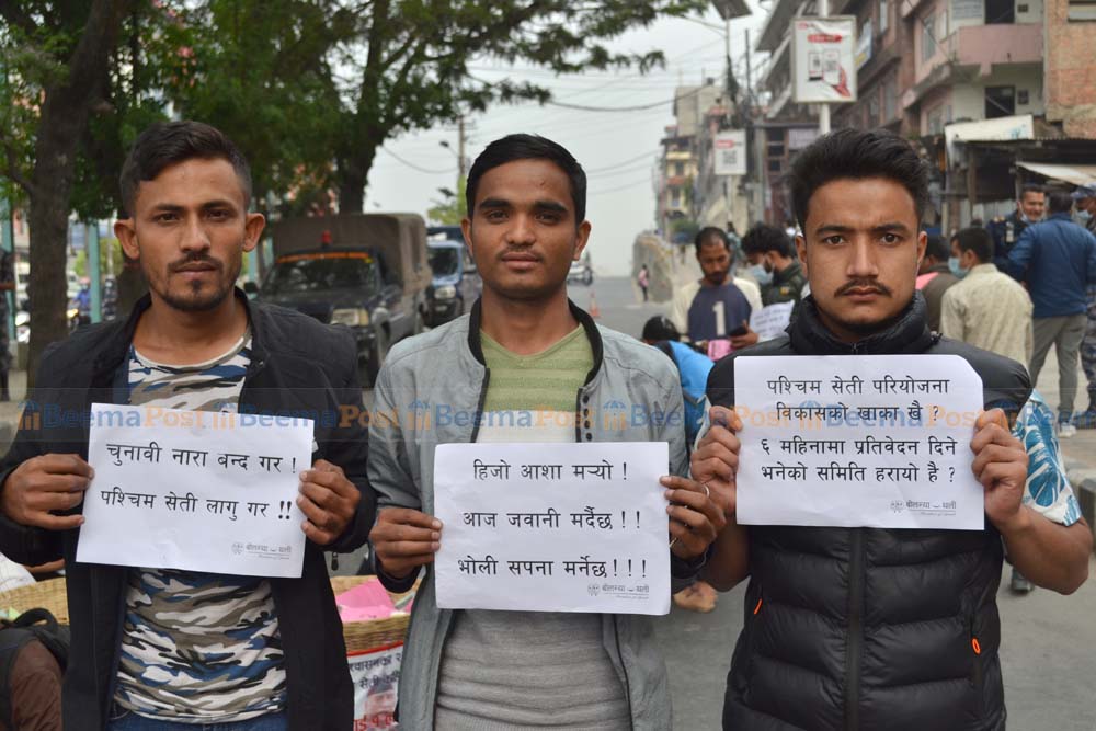 आज दबाब स्वरुप आश्वासनका २८ वर्ष पश्चिम सेती कहिले बन्छ ? आजको रोगलाई त जितौला भोलिको भोकलाई के गरौँलारु ? रिभर्स माइग्रेसनको व्यवस्थापन गरौँ, आश्वासन अति भो, धैर्य गर्ने कति हो ?, हिजो आशा म¥यो, आज जवानी मर्दै छ, भोलि सपना मर्ने छ लगायत नारासहित बोलन्या थलीले प्रदर्शन गरेको छ । यसअघि करिब ३ वर्ष अगाडि पनि कचौरा लिएर काठमाडौंको माइतीघर मण्डलमा प्रदर्शन गरेको थियो ।
