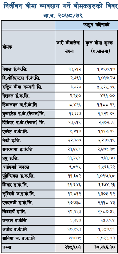 फागुनमा मात्रै २० निर्जिवन बीमा कम्पनीले संकलन गरे साढे तीन अर्ब, जनरल इन्स्योरेन्सको सबैभन्दा कम