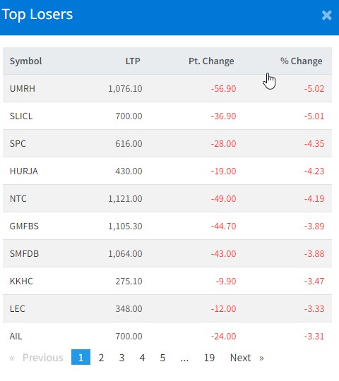त्यस्तै, सूर्या लाइफ इन्स्योरेन्सको ५.०१ प्रतिशत, समलिङ पावरकको ४.३५ प्रतिशत, हिमालयन उर्जा विकासको ४.२३ प्रतिशत, नेपाल दुरसञ्चारको ४.१९ प्रतिशत र गणपति लघुवित्तको ३.८९ प्रतिशतले घटेको हो ।
