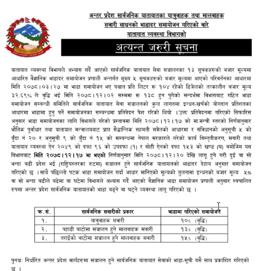 काठमाडौं । सरकारले अन्तर प्रदेश चल्ने लामा दूरीका सार्वजनिक सवारीको भाडा १५ प्रतिशतसम्म बढाएको छ । यातायात व्यवस्था विभागले भौतिक पूर्वाधार तथा यातायात मन्त्रालयको मन्त्रीस्तरीय निर्णय अनुसार यात्रुबाहक सवारी साधनमा भने भाडा १० प्रतिशतले बढाएको हो ।