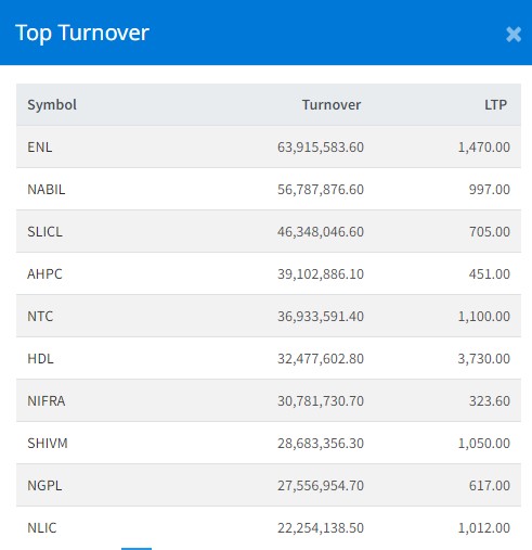 त्यस्तै, नबिल बैंकको ५ करोड ६७ लाख, सूर्या लाइफ इन्स्योरेन्सको ४ करोड ६३ लाख, अरुण भ्याली हाइड्रोपावरको ३ करोड ९१ लाख र नेपाल टेलिकमको ३ करोड ६९ लाख रुपैयाँ भन्दा माथिको कारोबार भएको छ ।