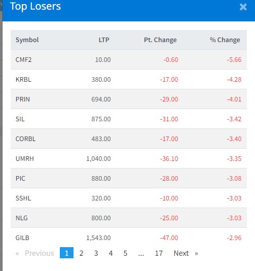 त्यस्तै, कर्णाली डेभलपमेन्ट बैंकको ४.२८ प्रतिशत, प्रभु इन्स्योरेन्सको ४.०१ प्रतिशत, सिद्धिर्थ इन्स्योरेन्सको ३.४२ प्रतिशत र कर्पोरेट डेभलपमेन्ट बैंकको ३.४० प्रतिशतले घटेको हो ।