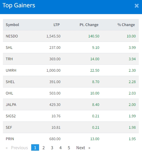 त्यस्तै, सोल्टी होटलको ३.९९ प्रतिशत, तारागाँउ रिजेन्सि होटलको ३.९४ प्रतिशत, यूनाइटेड इदि मार्दी आरबि हाइड्रोपावरको २.३० प्रतिशत, सिन्गटी हाइड्रो इर्नजीको २.२८ प्रतिशत र ओरियन्टल होटलको २.०३ प्रतिशतले बढेको हो ।