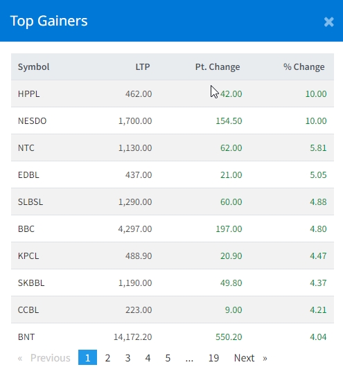 त्यस्तै, नेपाल दुरसञ्चारको ५.८१ प्रतिशत, एक्सल डेभलपमेन्ट बैंकको ५.०५ प्रतिशत, सामुदायिक लघुवित्तको ४.८८ प्रतिशत, बिशाल बजारको ४.८० प्रतिशत र कालिका पावरको ४.४७ प्रतिशतले बढेको हो ।