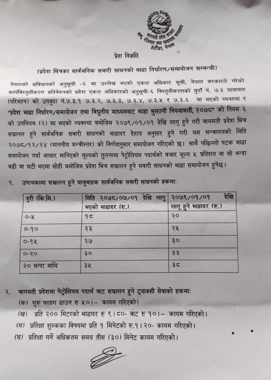 बाग्मती प्रदेशको सार्वजनिक सवारी साधनको भाडादर सूची सार्वजनिक
