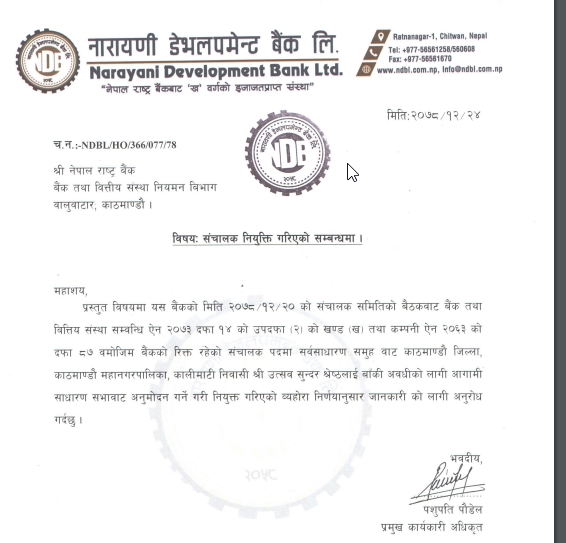 काठमाडौं । नारायणी डेभलपमेन्ट बैंकले संचालक नियुक्ति गरेको छ । बैंकले संचालकमा उत्सव सुन्दर श्रेष्ठलाई नियुक्त गरेको हो ।