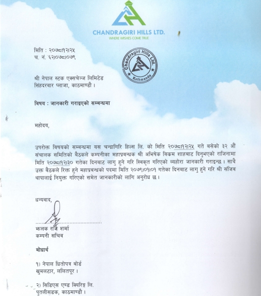 काठमाडौं । चन्द्रागिरि हिल्स लिमिटेडका महाप्रबन्धक अभिषेक विक्रम शाहले राजिनामा दिएका छन् ।