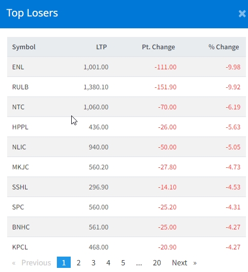त्यस्तै, नेपाल दुरसञ्चारको ६.१९ प्रतिशत, हिमालयन पावर पाट्नरको ५.६३ प्रतिशत, नेपाल लाईफ इन्स्योरेन्सको ५.०५ प्रतिशत, मैलुङ खोला जलविद्युतको ४.७३ प्रतिशत र शिव श्री हाइड्रोपावरको ४.५३ प्रतिशतले घटेको हो ।