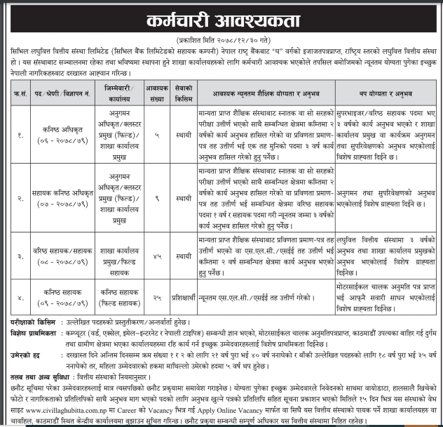 कम्पनीले कनिष्ठ अधिकृतमा ५ जना, सहायक कनिष्ठ अधिकृतमा ९ जना, बरिष्ठ सहायक। सहायकमा ४५ जना र कनिष्ठ सहायकममा २५ जना कर्मचारी माग गरेको हो । जसका लागि शैक्षिक योग्यता एसइई उत्तिर्ण देखि स्नातक उत्तिर्ण गरेको तथा लघुुवित्त क्षेत्रमा अनुभवी कर्मचारीलाई माग गरेको छ ।