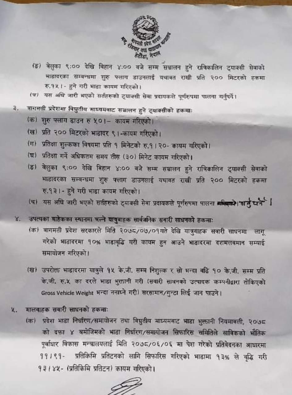 प्रदेशले सार्वजनिक गरेको भाडादरमा अबं उपत्यकामा ० देखी ५ किलोमिटरसम्मको २० रुपैयाँ, १० किलोमिटरसम्ममा २५ रुपैयाँ, १५ किलोमिटरसम्ममा ३० रुपैयाँ, २० किलोमिटरसम्ममा ३३ रुपैयाँ र २० भन्दा माथि ३८ रुपैयाँ लिन पाउनेछन् । त्यस्तै बागमति ट्याक्सीमा प्रति २०० मिटरको भाडादर ९।८० रुपैयाँबाट १० रुपैयाँ कायम गरिएको छ । प्रतिक्षा शुल्कका विषयमा प्रति १ मिनेटको १।२० रुपैयाँ र प्रतिक्षा गर्ने अधिकतम समय तीस मिनेट कायम गरिएको छ ।