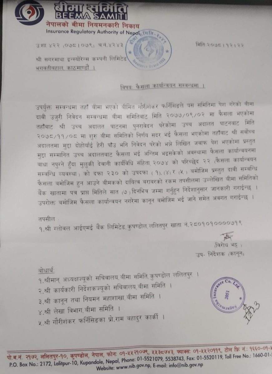 सगरमाथा इन्स्योरेन्सद्धारा चार करोड दाखिला गरी फैसला कार्यान्वयन गर्न अस्वीकार, बीमा समितिको पत्र नक्सालमा अलपत्र