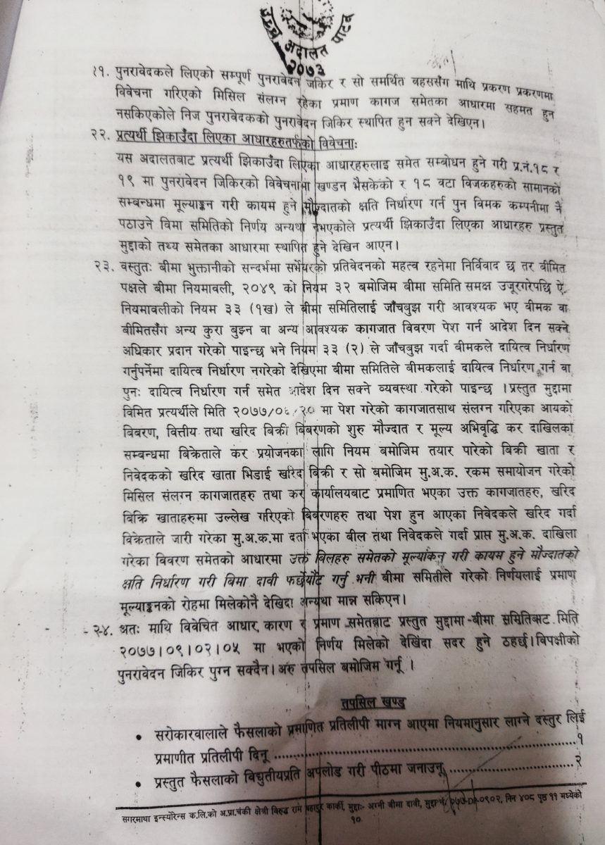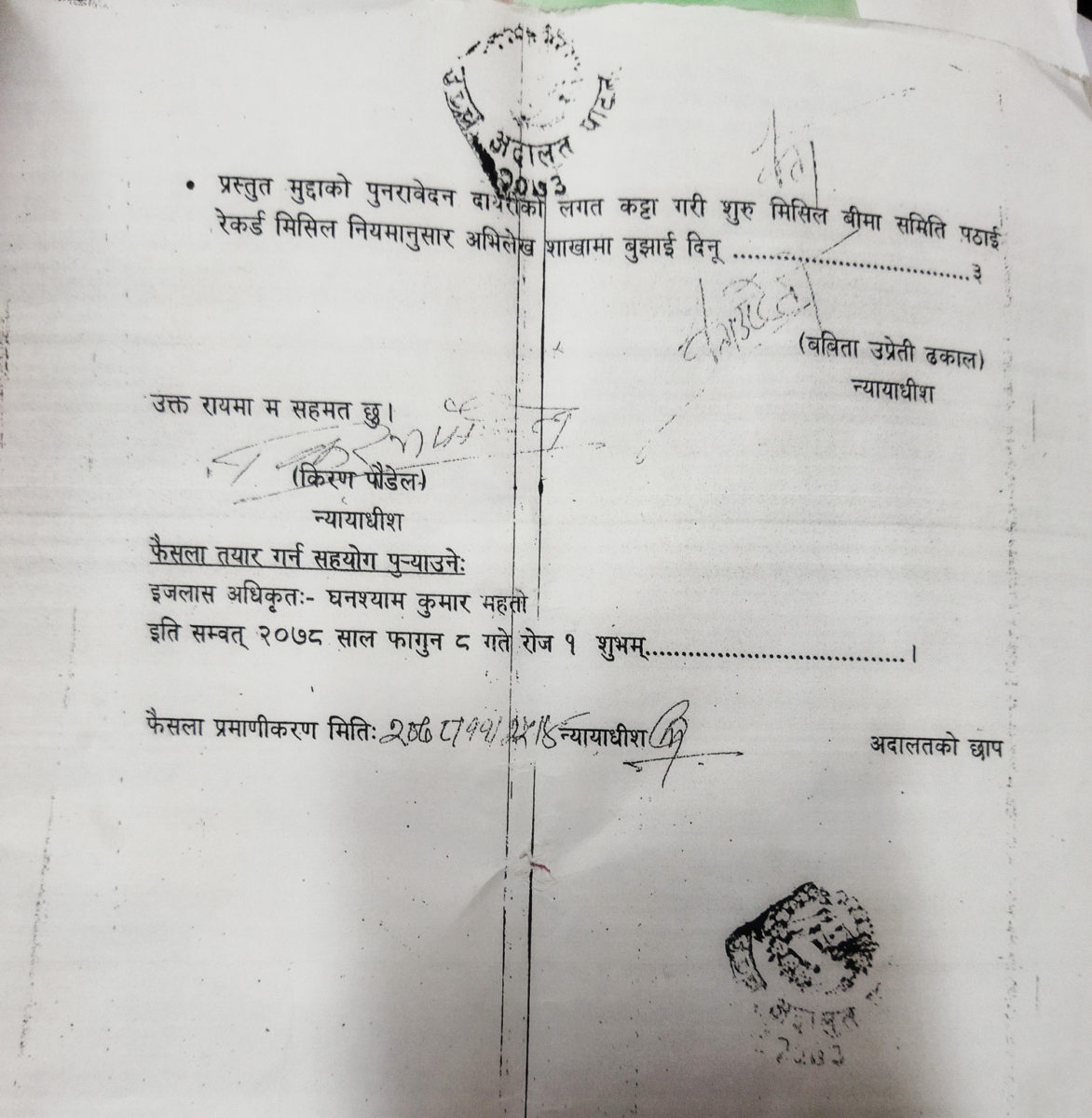 उच्च अदालत पाटनको फागुन ८ गतेको इजलाशले सगरमाथा इन्स्योरेन्स कम्पनीले बीमितलाई तीन करोड ९४ लाख रुपैयाँ भुक्तानी गर्नुपर्ने ठहर गरेपनि सगरमाथा इन्स्योरेन्स कम्पनीले भुक्तानी गरेको छैन ।