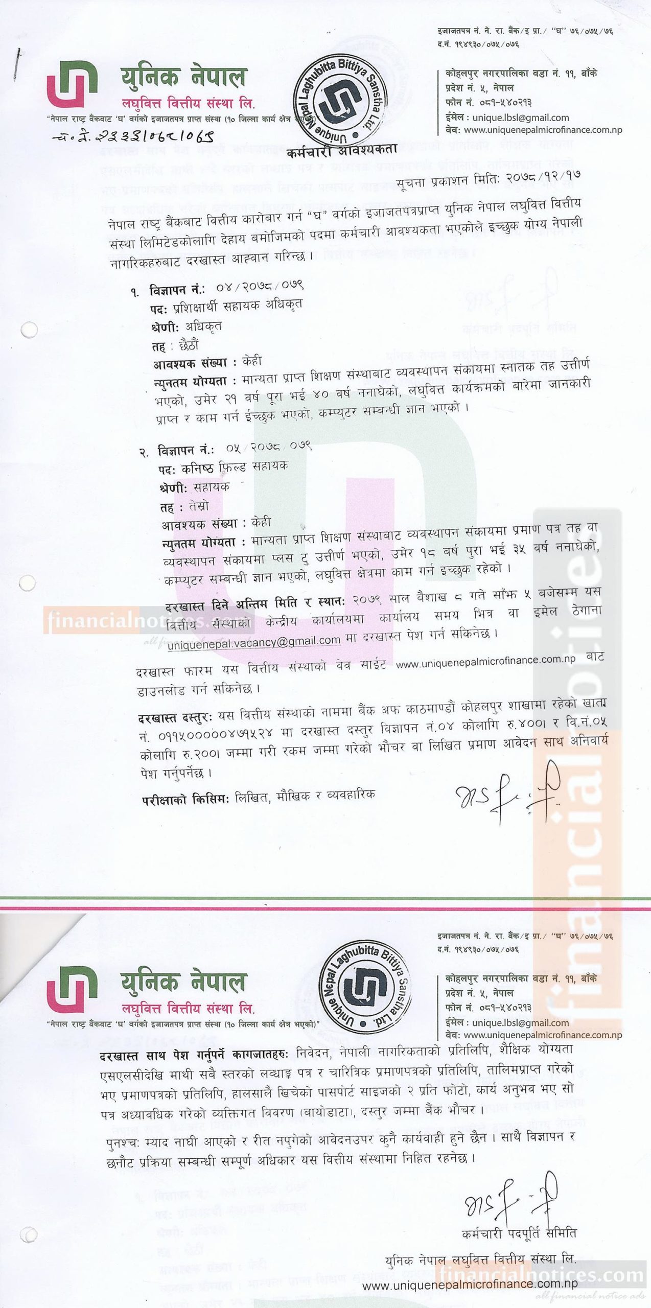 युनिक नेपाल लघुवित्तद्धारा कर्मचारी माग, कति चाहिन्छ शैक्षिक योग्यता