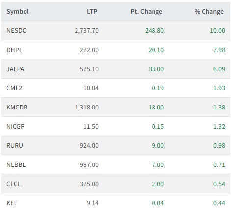 त्यस्तै, दिव्यश्वरी हाईड्रोपावर, जालपा सामुदायिक लघुवित्त, सिटिजन म्युचुअल फन्ड२, कालिका लघुवित्त, एनआईसी एशिया ग्रोथ फन्ड, रुरु जलविधुत्, नेरुड लघुवित्त, सेन्ट्रल फाइनान्स र कुमारी इक्विटी फन्डका लगानीकर्ताले आज सर्वाधिक कमाएका छन् ।
