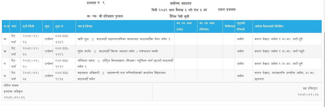 गत चैत २४ गते मन्त्रिपरिषदको बैठकले गभर्नर अधिकारीमा कार्यक्षमताको अभाव भएको भन्दै जाँचबुझ गर्ने समिति गठन गरेपछि उक्त निर्णय उत्पे्रषणको आदेशले बदर गर्दै गर्भनरको रुपमा काम गर्न नरोक्न माग गर्दै अधिकारी सर्वोच्च अदालतमा पुगेका थिए । अधिकारीको रिटमाथि सुनुवाई गर्दै सर्वोच्च अदालतका न्यायाधिश हरि प्रसाद फुयाँलले यस्तो आदेश दिएका हुन् । न्यायाधिश फुयाँल प्रम ओली पहिलो पटक प्रधानमन्त्री हुँदा महान्याधिवक्ता थिए ।