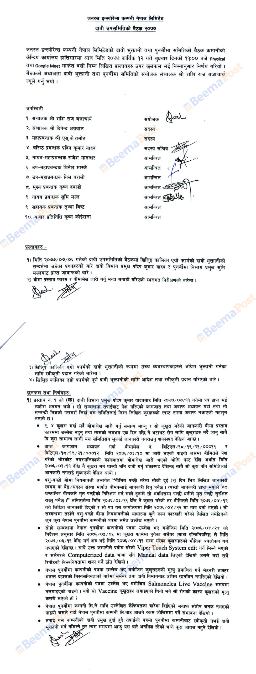 नेपाल पुनर्बीमा कम्पनीले सो बीमा दावी भुक्तानीको सम्बन्धमा जनरल इन्स्योरेन्स कम्पनीलाई ७ वटा वटा गैर कानुनी र सम्झौता उल्लंघनका घटनाहरु पाइएकोले दावी भुक्तानी दिन नसक्ने पत्र २०७७ साल साउन २२ गते दिएपछि जनरल इन्स्योरेन्स कम्पनीका दावी समितिका संयोजक शशी श्रेष्ठको अध्यक्षतामा छानविन गरिएको थियो । सो समितिले पुनर्बीमा कम्पनीले कुखुरा मर्न थालेपछि बीमा गराएको, कुखुरा मरेको धेरै समय पछि मात्रै सर्भेयर पुगेको, कुखुरा मरेको हो भनेर प्रमाणित गर्ने चिकित्सक मोबाइल भेटेनरी क्लीनिकका अनन्त दाहाल भनिएकोमा सो क्लिनिकमा बलराम थापा नाम गरेको डाक्टर भेटिएको र अनन्त दाहाल नाम गरेको चिकित्सक सो क्लिनिकमा कार्यरत नरहेको प्रमाणित भएकोले उक्त दावी फर्जी हुनसक्ने जानकारी जनरल इन्स्योरेन्स कम्पनीलाई गराएको पाइएको भन्ने नेपाल पुनर्बीमा कम्पनीको जिकिरलाई अन्यथा मान्न नसकिने निर्णय गरेको थियो ।