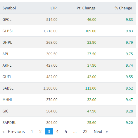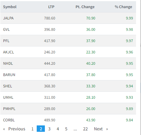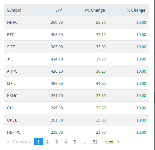 आज तीन दर्जनभन्दा बढी शेयरमा हरीयाली छाएको छ । आज नेशनल हाईड्रोपावर, वेष्ट फाइनान्स, श्री इन्भेष्टमेन्ट, जानकि फाइनान्स, अरुण भ्याली, मञ्जुश्री फाइनान्स, खानी खोला, घलेम्दी हाईड्रोपावर, युनिभर्सल पावर र हिमाल दोलखा पावरमन लगानीकर्ताले सर्वाधिक कमाएका छन् ।