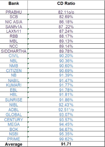 त्यस्तै, ९१ र ९० प्रतिशतको हाराहारीमा सीडी रेसियो हुने बैंकहरूमा सनराइज बैंक, हिमालयन, एभरेष्ट, कुमारी, नबिल, नेपाल बंगलादेश, सिटिजन्स, एनएमबी, नेपाल बैंक र सिभिल बैंक छन् ।