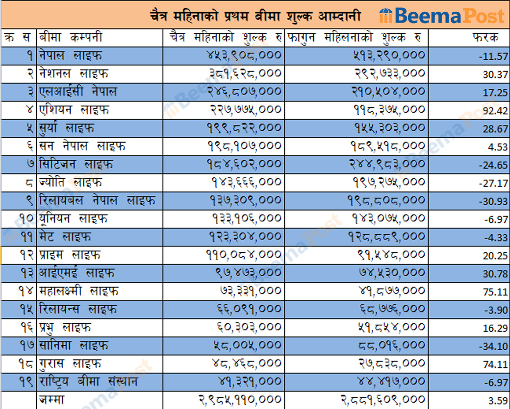१९ जीवन बीमा कम्पनीले चैत्र महिनामा संकलन गरे तीन अर्ब, कसको घट्यो, कसको बढ्यो ?