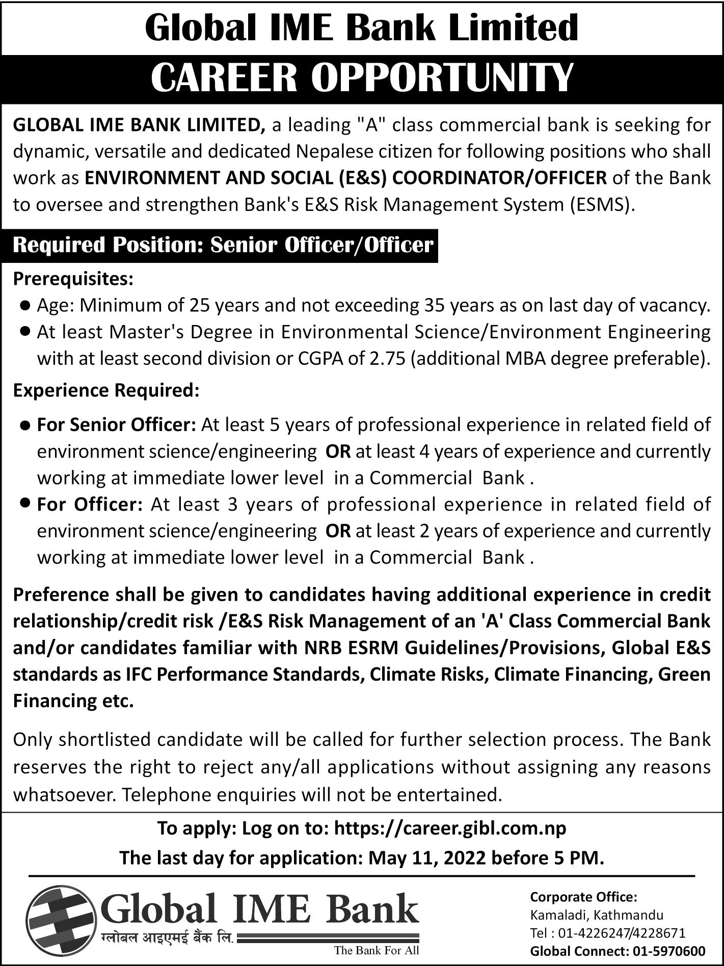 काठमाडौं । ग्लोबल आइएमई बैंक लिमिटेडले रोजगारीको अवसर खुलाएको छ । बैंकले एक सूचना प्रकाशित गर्दै सिनियर अफिसर।अफिसर आवश्यक रहेको जनाएका हो ।