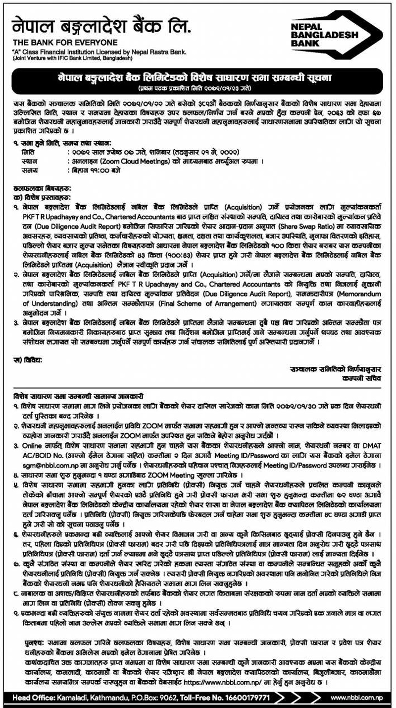काठमाडौं । नेपाल बंगलादेश बैंक लिमिटेडले विशेष साधारण सभा डाकेको छ । बैंकले आगामी जेठ ७ गते बस्नेगरी सभा आह्वान गरेको हो ।