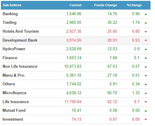 अघिल्लो दिन नेप्सेमा रहेको १३ उपसूचकमध्ये बैकिङ्ग समुह र माइक्रोफाइनान्स समुह बाहेकका सबै सूचक सबै माथि उक्लिएका थिए । आज १३ उपसूचक मध्ये होटल तथा पर्यटन समुह, विकास बैंक समुह, जीवन बीमा समुह र लगानी समुह बाहेकका सबै सूचक बढोत्तरी भएको छ । आइतबार सर्वाधिक बृद्धि भएको विकास बैंक समुह आज २०.९१ रुपैयाँले घट्न पुगेको छ ।