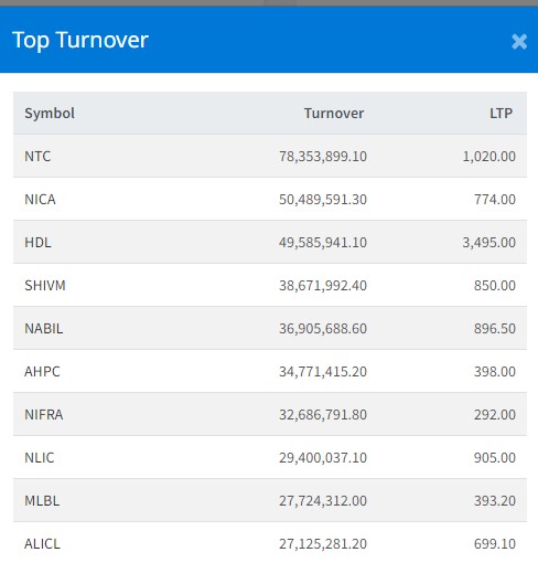 आजपनि कारोबार करिब पौने एक अर्बमा कारोबार सीमित हुन पुगेको छ । सो रकम बराबरको कारोबार हुँदा सर्वाधिक नेपाल टेलिकमको शेयर बढी खरिदबिक्री भएको छ । कम्पनीको आज एकैदिन ७ करोड ८३ लाख ५३ हजार ८९९ रुपैयाँको कारोबार भएको छ ।