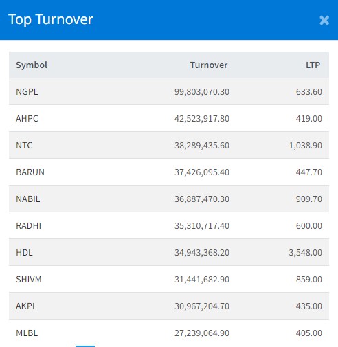 त्यस्तै दोस्रोमा अरुण भ्याली हाइड्रोपावरको ४ करोड २५ लाख, एनिटिसीको ३ करोड ८२ लाख, बरुण हाइड्रोपावरको ३ करोड ७४ लाख र नबिल बैंकको ३ करोड ६८ लाख रुपैयाँ भन्दा माथिको कारोबार भएको छ ।