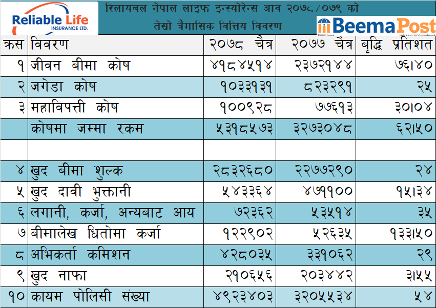 रिलायबल नेपाल लाइफको अभिकर्ता कमीशन २९ प्रतिशतले बढ्यो, कम्पनीको अन्य वित्तिय सूचक कस्तो ?