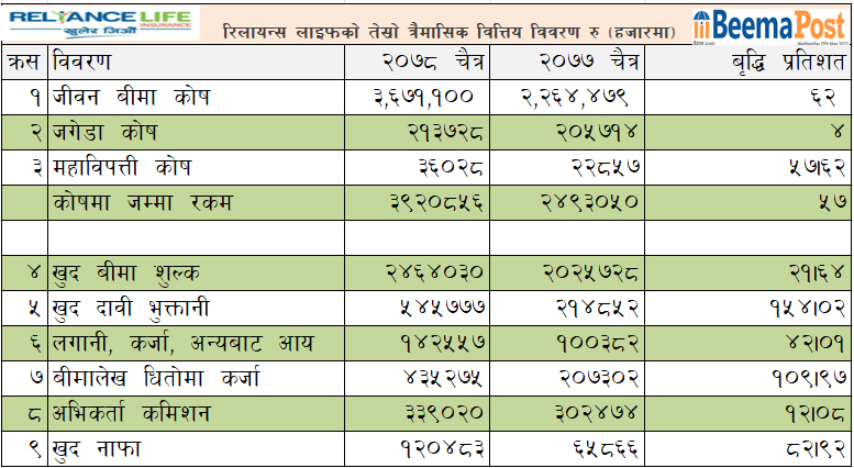 चालु आर्थिक वर्षको तेस्रो त्रैमाशिक अवधिमा कम्पनीले २ अर्ब ४६ करोड रुपैयाँ बीमा शुल्क आर्जन गरेको छ । गत वर्षको यहि अवधिमा २ अर्ब २ करोड थियो ।त्यस्तै गत आर्थिक बर्षको तुलनामा कम्पनीको मुनाफा ८२।९२ प्रतिशतले वृद्धि भएको छ । यसअवधिमा कम्पनीले १२ करोड ४ लाख रुपैयाँ मुनाफा आर्जन गरेको छ । गत वर्षको यहि अवधिमा ६ करोड ५८ लाख रुपैयाँ मुनाफा आर्जन गरेको थियो ।