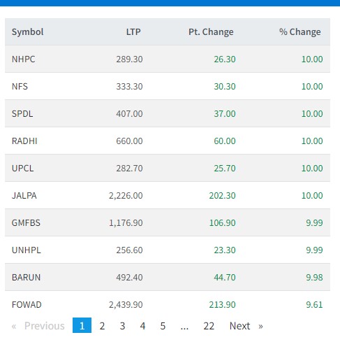आज नौ कम्पनीको शेयरमा सकारात्मक सर्किट लागेको छ। नेशनल हाईड्रोपावर, नेपाल फाइनान्स सिनर्जी पावर डेभलपमेन्ट, राद्यी विधुत्, युनिभर्सल पावर, जालपा लघुवित्तको शेयर १० प्रतिशतले बढेको छ ।