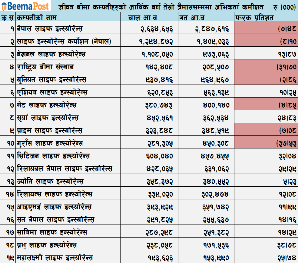 त्यस्तै, ज्योति लाइफले ३५ करोड ८३ लाख रुपैयाँ, रिलान्स लाइफले ३३ करोड ९० लाख रुपैयाँ, प्राइम लाइफले ३२ करोड रुपैयाँ, सन नेपाल लाइफले २९ करोड रुपैयाँ, सानिमा लाइफले २८ करोड रुपैयाँ, गुराँस लाइफले २८ करोड रुपैयाँ, प्रभु लाइफले २३ करोड रुपैयाँ, महालक्ष्मी लाइफले १९ करोड रुपैयाँ र राष्ट्रिय बीमा संस्थानले १४ करोड २४ लाख रुपैयाँ बीमा अभिकर्ता कमीशनमा खर्चिएका छन् ।