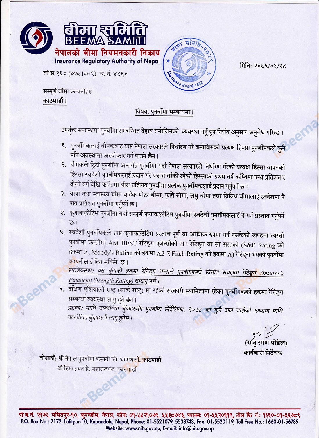 यही चैत्र २८ गते बीमा समितिका कार्यकारी निर्देशक राजुरमण पौडेलले जारी गरेको पुनर्बीमा सम्बन्धी निर्देशनले दोस्रो पटक हिमालयन रि इन्स्योरेन्स कम्पनीर्लाइ अर्बौ रुपैयाँ फाइदा पुग्ने भएको छ । कार्यकारी निर्देशक पौडेलले जारी गरेको च.न. ४६० को निर्देशन हिमालयन रि नामक निजि कम्पनीलाई अर्बौ रुपैयाँको व्यवसाय सुनिश्चित गरी फाइदा पुग्नेछ । त्यसैगरी, सोही निर्देशनले नेपाल पुनर्बीमा कम्पनीलाई अनावश्यक जोखिमको भार थोपर्ने काम गरेकोछ । बीमा समितिले नीतिगत रुपमा गरेको उक्त निर्णयले सरकारी कम्पनीलाई घाटा पुग्ने र निजि कम्पनीलाई अर्बौ रुपैयाँ फाइदा पुग्ने हुँदा बीमा समितिले गरेको अर्को नीतिगत अनियमितताको रुपमा उक्त निर्देशनलाई हेरिएको छ ।