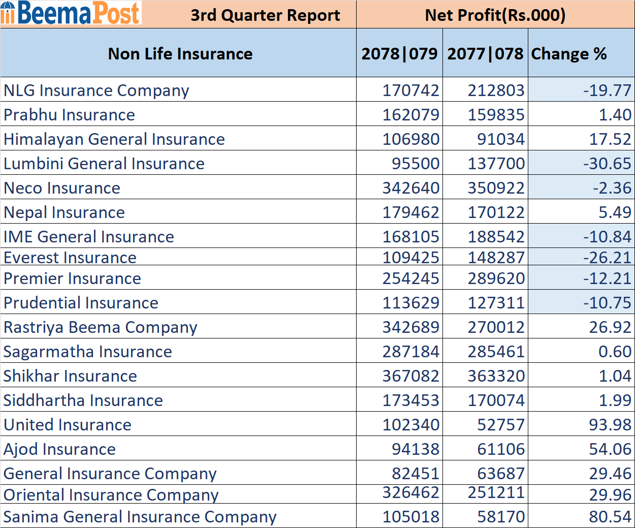 एनएलजी इन्स्योरेन्सको नाफा १९ प्रतिशतले, लुम्बिनी जनरलको नाफा ३० प्रतिशत, नेको इन्स्योरेन्सको २ प्रतिशत, आइएमई जनरल इन्स्योरेन्को १० प्रतिशत, एभरेष्ट इन्स्योरेन्सको २६ प्रतिशत, प्रिमियर इन्स्योरेन्सको १२ प्रतिशत र प्रुडेन्सियल इन्स्योरेन्सको १० प्रतिशतले मुनाफा घटेको कम्पनीहरुले प्रकाशन गरेको तथ्यांकमा उल्लेख रहेको छ ।