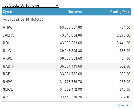 कम्पनीको ५ करोड ३८ लाख ३० हजार रुपैयाँको शयेर कारोबार भएको हो ।शेयर बजारमा सामान्य सुधार आँउदा जाल्पा सामुदायिक लघुवित्तको ४ करोड ९५ लाख रुपैयाँ, हिमालयन डिष्टलरीको ४ करोड ३९लाखरुपैयाँ, नेपाल लाइफ को ३ करोड ९० लाख रुपैयाँ, अरुण काबेली पावरको ३ करोड ६२ लाख रुपैयाँ र रादी जलविधुत् कम्पनी ३ करोड ६० लाख रुपैयाँको कारोबार भएको हो ।