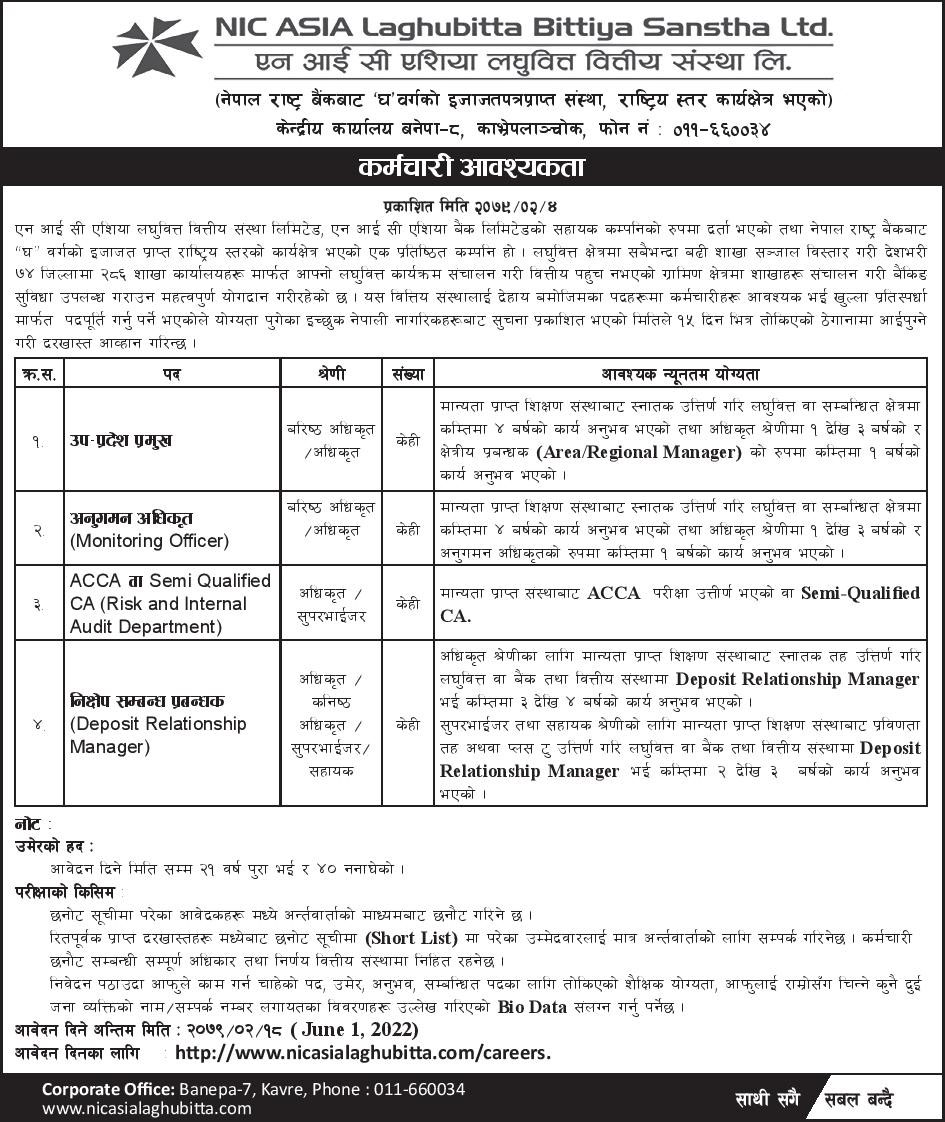 लघुवित्तले उप–प्रदेश प्रमुख, अनुगमन अधिकृत, एसीसीए वा सेमि क्वालिफाइड सीए (अधिकृत सुपरभाइजर) र निक्षेप सम्बन्ध प्रबन्धकमा केही संख्यामा रोजगारीको अवसर खुलाएको हो ।