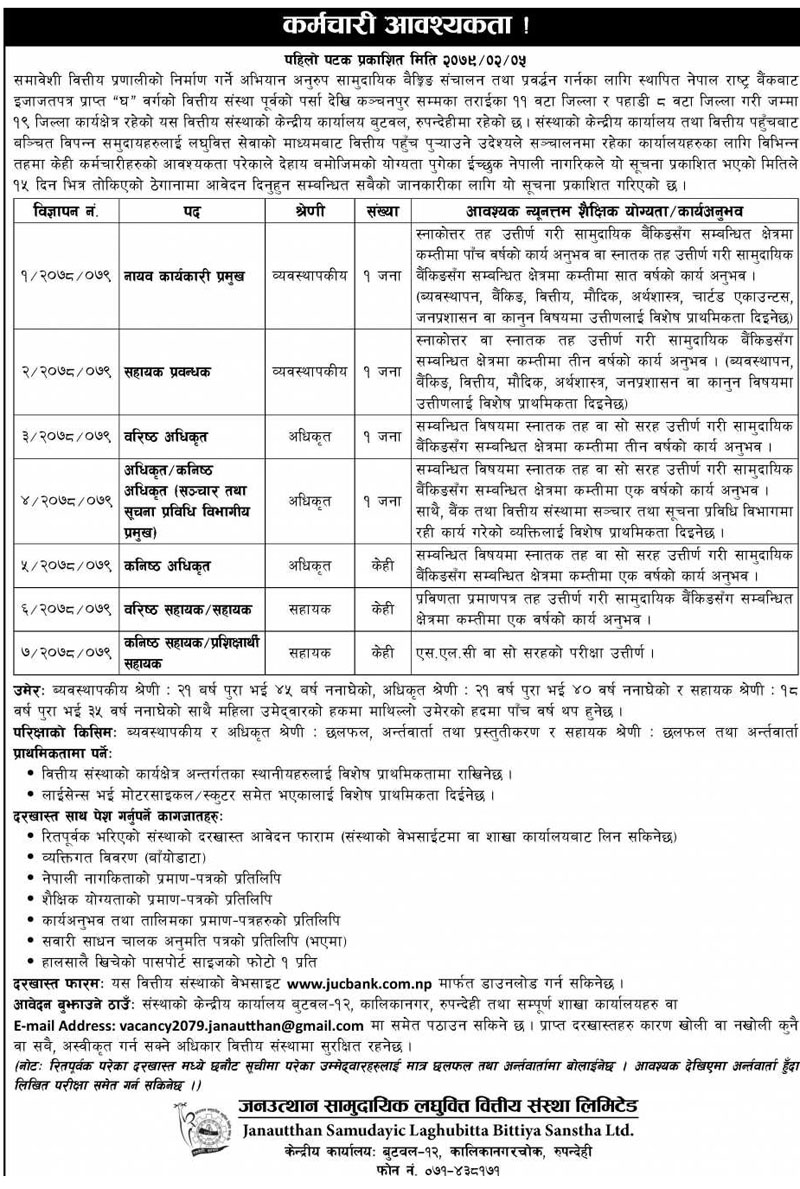जनउत्थान लघुवित्तले नायब कार्यकारी प्रमुख, सहायक प्रबन्धक, बरिष्ठ अधिकृत, अधिकृत।कनिष्ठ अधिकृत (सञ्चार तथा सूचना प्रविधि विभागीय प्रमुख) मा एक–एक जना कर्मचारी माग गरेको हो । त्यस्तै, कष्ठि अधिकृत, बरिष्ठ सहायक।सहायक, कनिष्ठ सहायक।प्रशिक्षार्थी सहायकमा केही संख्यामा कर्मचारी मागेको छ ।