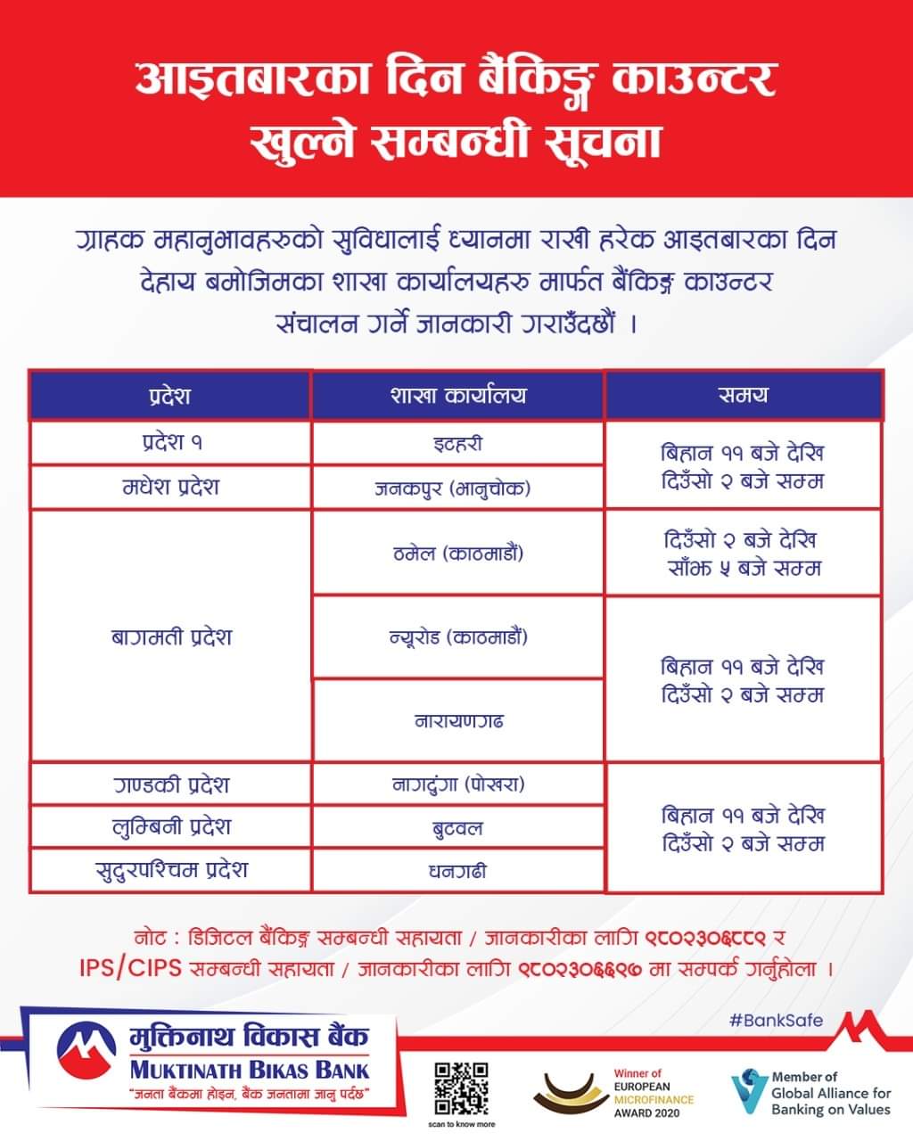 काठमाडौं । मुक्तिनाथ विकास बैंक लिमिटेडले आइतबार सार्वजनिक बिदाको दिन पनि आफ्नो सीमित शाखा कार्यालयबाट बैंकिङ सुबिधा दिने भएको छ ।