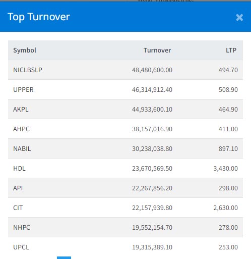 त्यस्तै, अपर तामाकोशी हाइड्रोपावरको ४ करोड ६३ लाख रुपैयाँ, अरुण काबेली पावरको ४ करोड ४९ लाख रुपैयाँ, अरुण भ्याली हाइड्रोपावकरो ३ करोड ८१ लाख रुपैयाँ र नबिल बैंकको ३ करोड २ लाख रुपैयाँ भन्दा माथिको कारोबार भएको छ । समग्रमा हेर्दा आज सर्वाधिक लगानीकर्ताहरुले हाइड्रोपावर कम्पनीहरुको शेयर खरिदबिक्री गरेका छन् ।