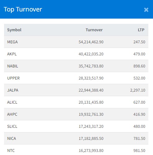 त्यस्तै, अरुण काबेली पावरको ४ करोड ४ लाख, नबिल बैंकको ३ करोड ५७ लाख, अपर तामाकोशीको २ करोड ८३ लाख र जाल्पा सामुदायिक लघुवित्तको २ करोड २९ लाख रुपैयाँ भन्दा माथिको कारोबार भएको छ ।