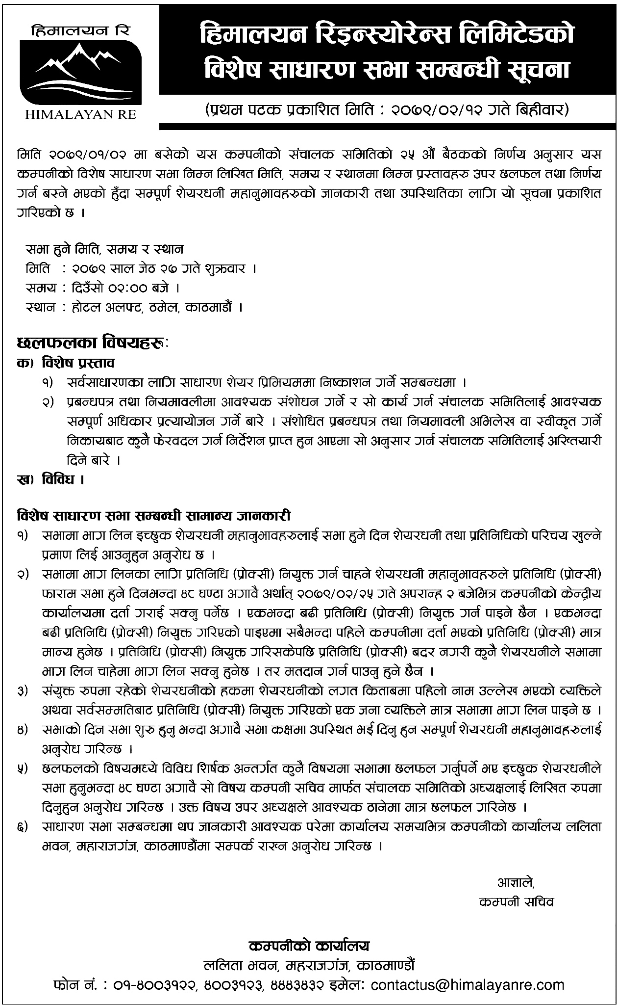 हिमालयन रि इन्स्योरेन्स कम्पनीको गत बैशाख २ गते बसेको सञ्चालक समितिको बैठकले आगामी जेठ २७ गते विशेष साधारणसभा आह्वान गर्ने निर्णय गरे बमोजिम आज सूचना प्रकाशित गरी विशेष साधारणसभा आह्वान गरेको छ । नेपाल सरकारले बैंक तथा वित्तिय संस्थामा प्रिमियम मूल्यमा आईपिओ जारी गर्न नदिने भन्दै हाल सञ्चालनमा रहेका जीवन बीमा कम्पनीहरुले एक वर्षदेखि प्रिमियम मूल्यमा आईपिओ जारी गर्न खोज्दा अनुमति नपाई अल्झिएर बसिरहेको अवस्था छ ।