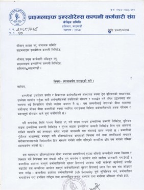 प्राइम लाइफ इन्स्योरेन्स कम्पनीका कर्मचारीहरुको सम्बन्धमा कुनै पनि निर्णय गर्नका लागि आधिकारिक ट्रेड युनियन कर्मचारी संघको प्रतिनिधि समेत रहने गरी एउटा उप समिति गठन गर्न माग गरेका छन् ।