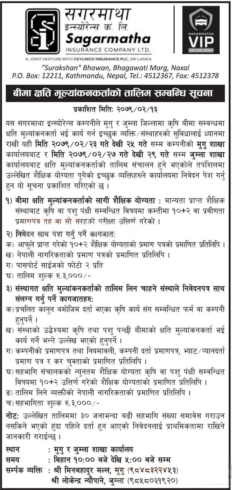 काठमाडौं । सगरमाथा इन्स्योरेन्स कम्पनी लिमिटेडले बीमा क्षति मूल्यांकनकर्ताको तालिम दिने भएको छ । कम्पनीले एक सूचना प्रकाशित गर्दै मुगु र जुम्ला जिल्लामा कृषि बीमा सम्बन्धमा क्षति मूल्यांकनकर्ता तालिम प्रदान गर्न लागेको हो ।