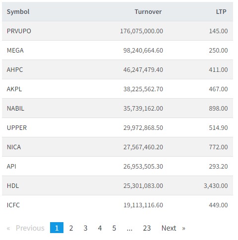आज प्रभु बैंकको संस्थापक शेयरको सबैभन्दा धेरै कारोबार भएको छ। त्यस्तै, मेगा बैंक, अरुण भ्याली पावर, अरुण काबेली, नबिल बैंक, अपर तामाकोशी, एनआईसी एशिया बैंक, अपी पावर, हिमलायन डिष्टिलरी र आइसीएफसी पावरको सर्वाधिक कारोबार भएको छ।